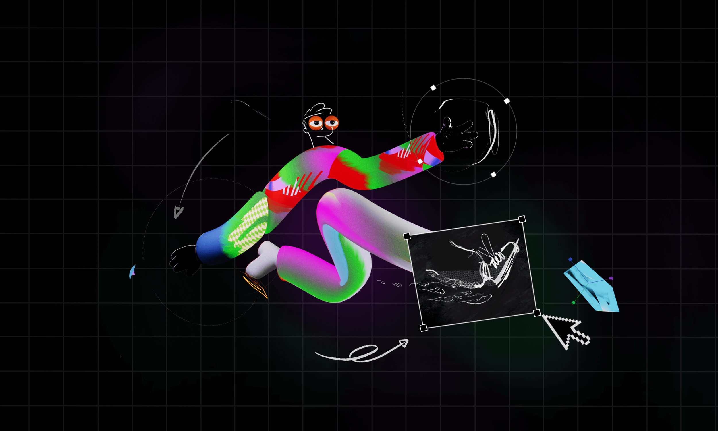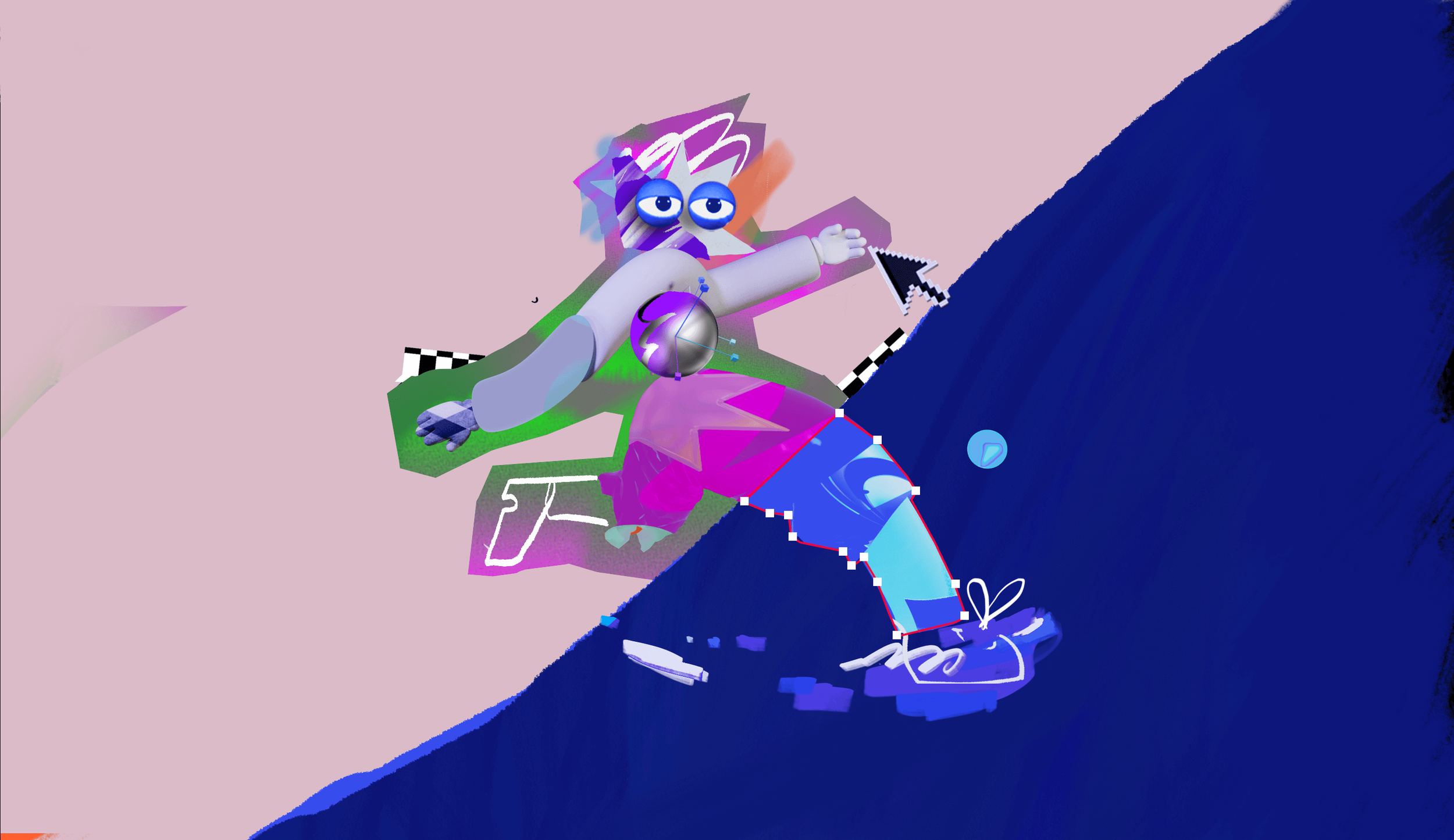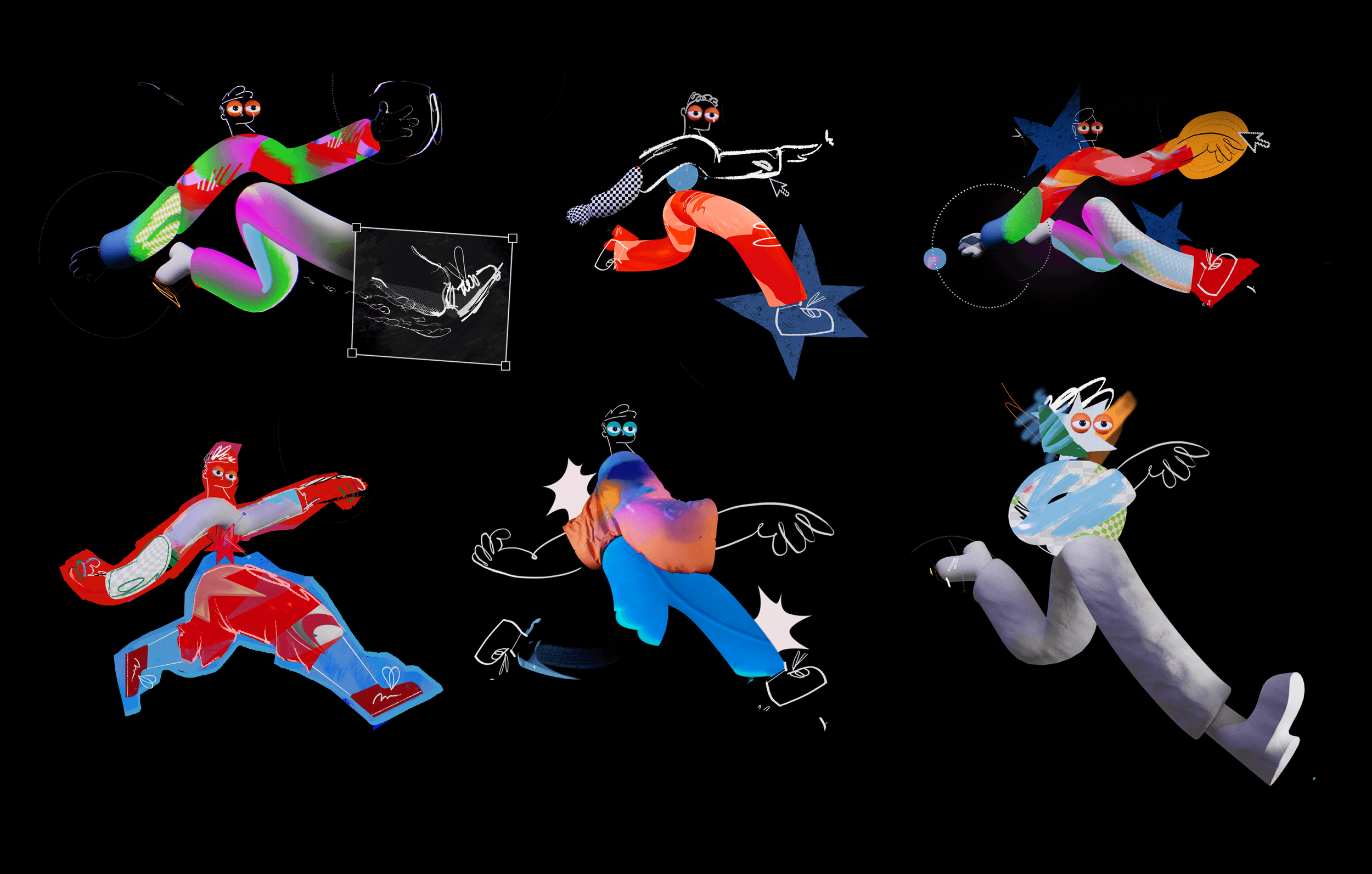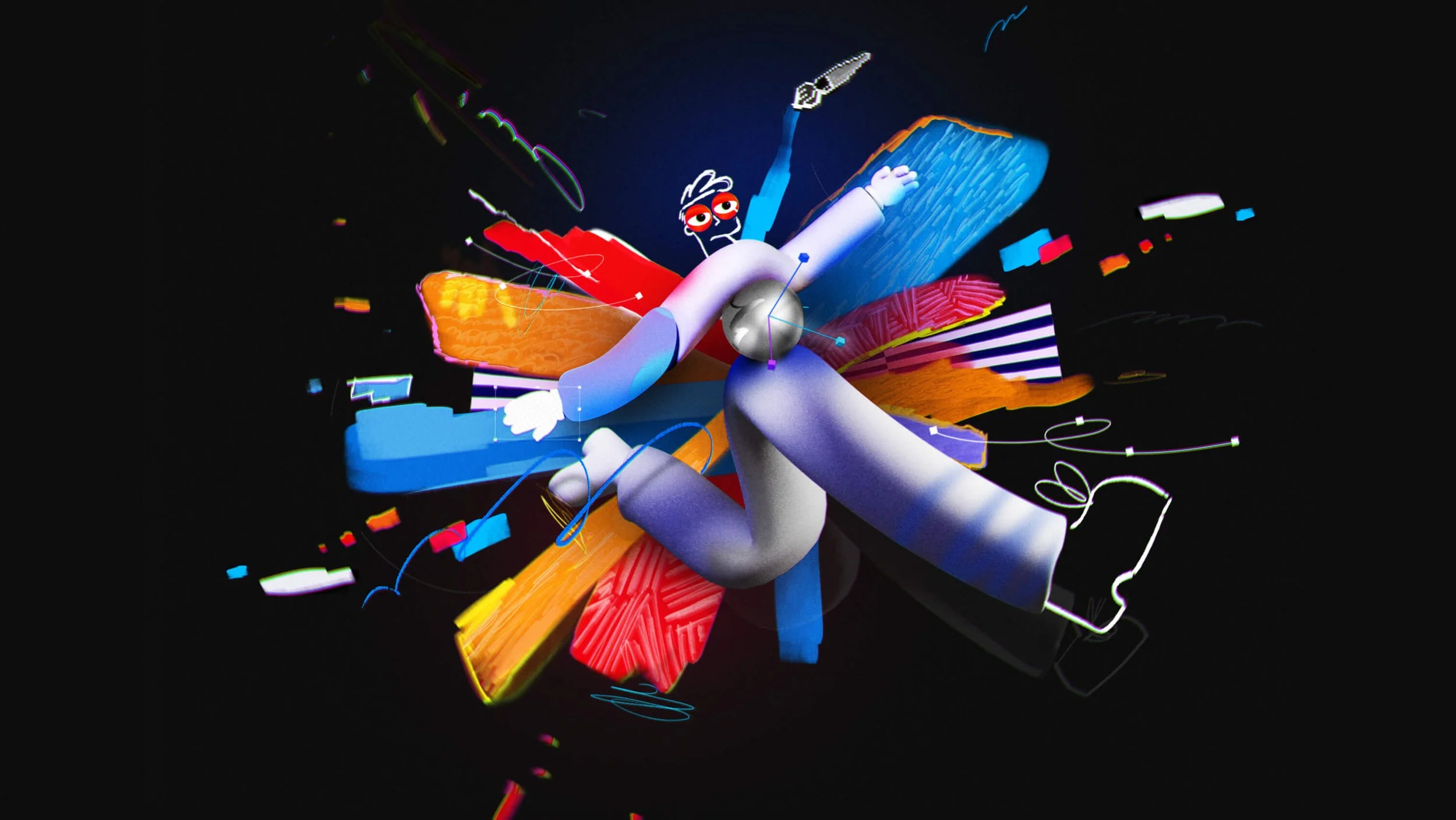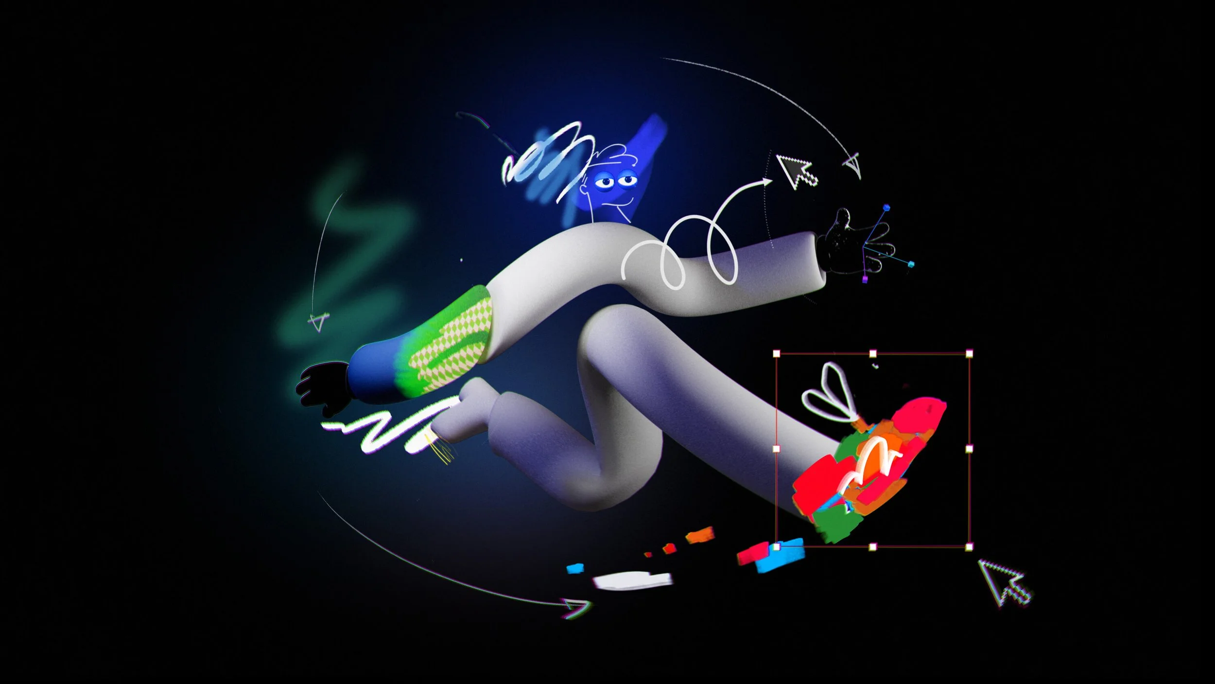 Our film was process-driven, showcasing the tools and techniques of the digital journey of the makers. Bounding boxes, anchor points, characters made of design elements…this entire video was one big nod to the design process. Our favorite part of this project was turning the exploration and development imagery into core art in the final product. Wireframe passes of the character running made it into the start of the run cycle to land the message that art is about process not product. We used screen recordings of layer selections, bad glitched renders that would otherwise hit the trash bin, happy accidents thoughtfully discovered, as well as comps with hundreds of layers to imitate all of the above.