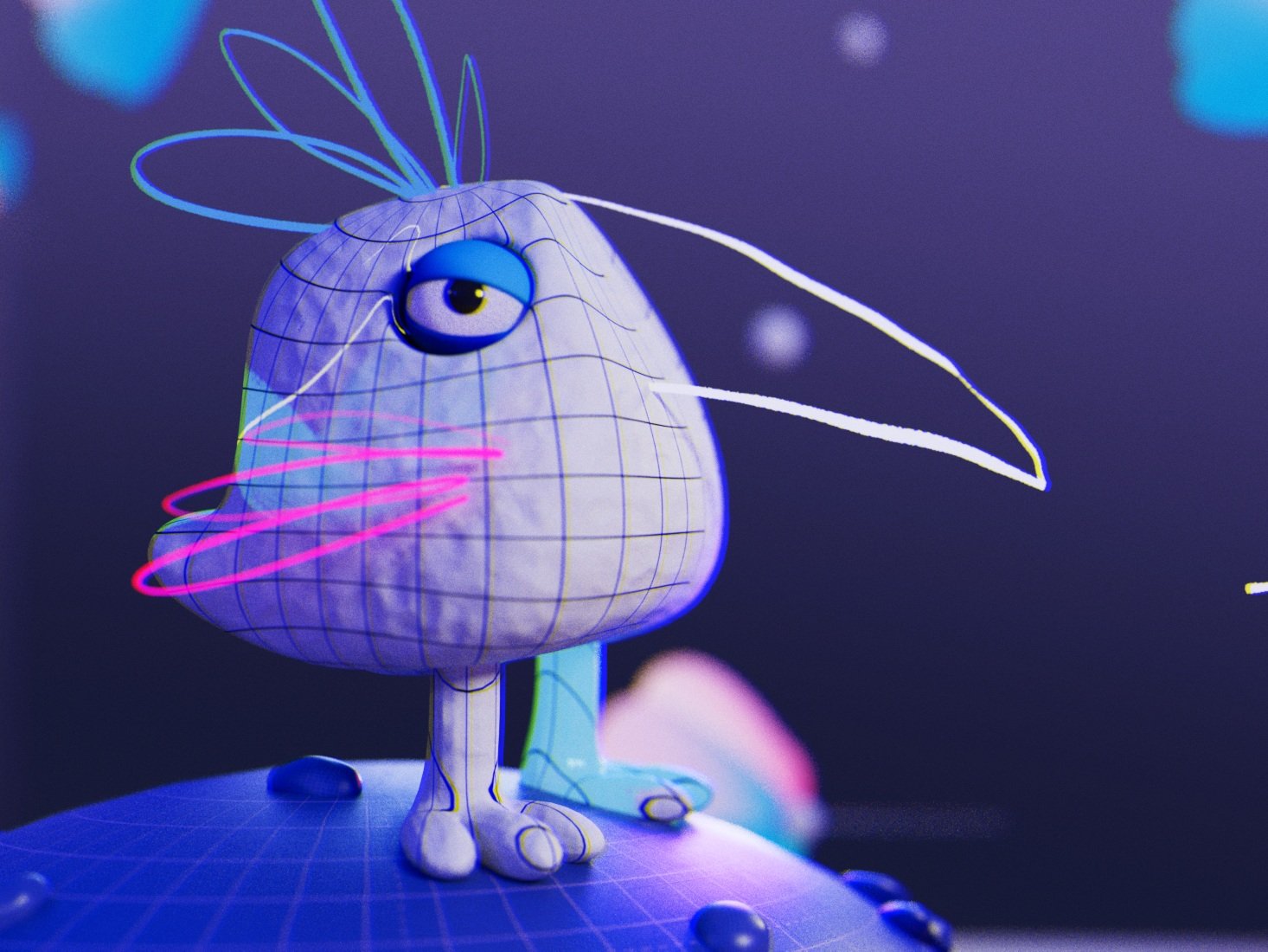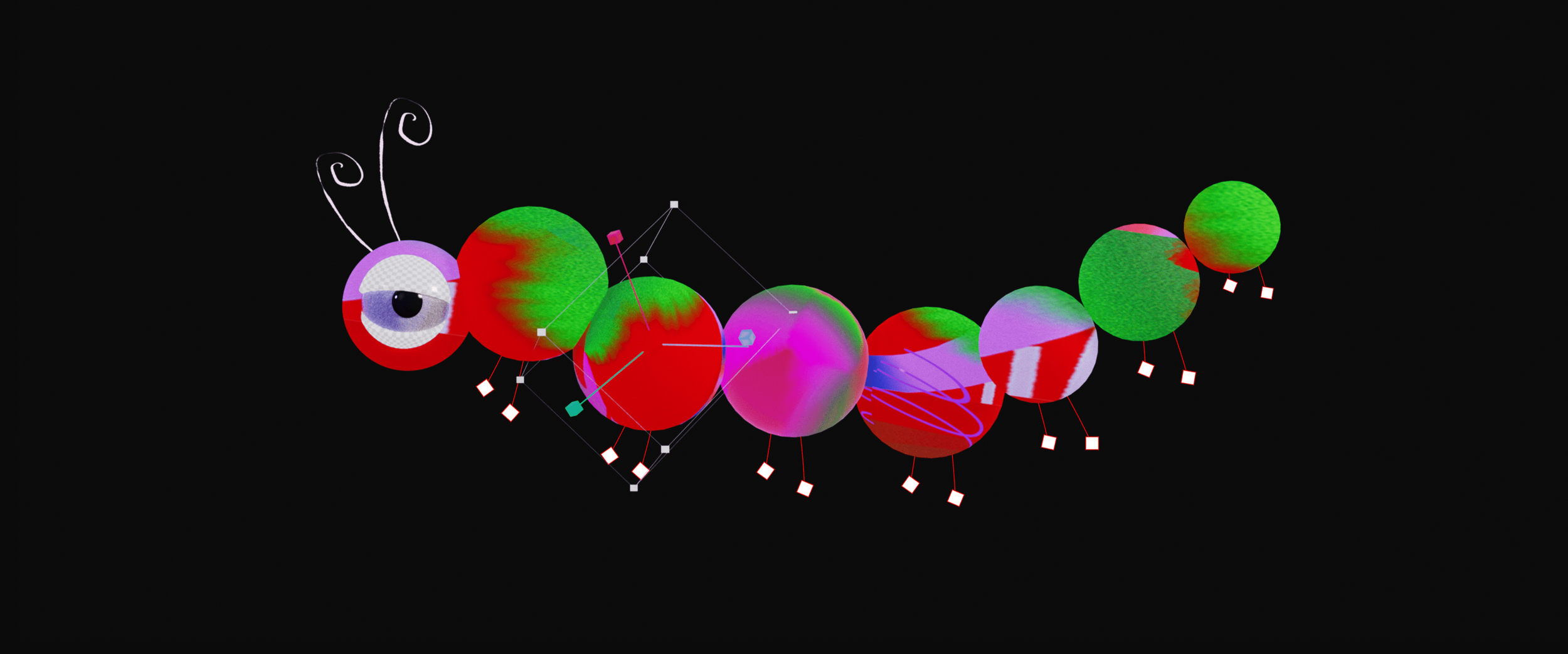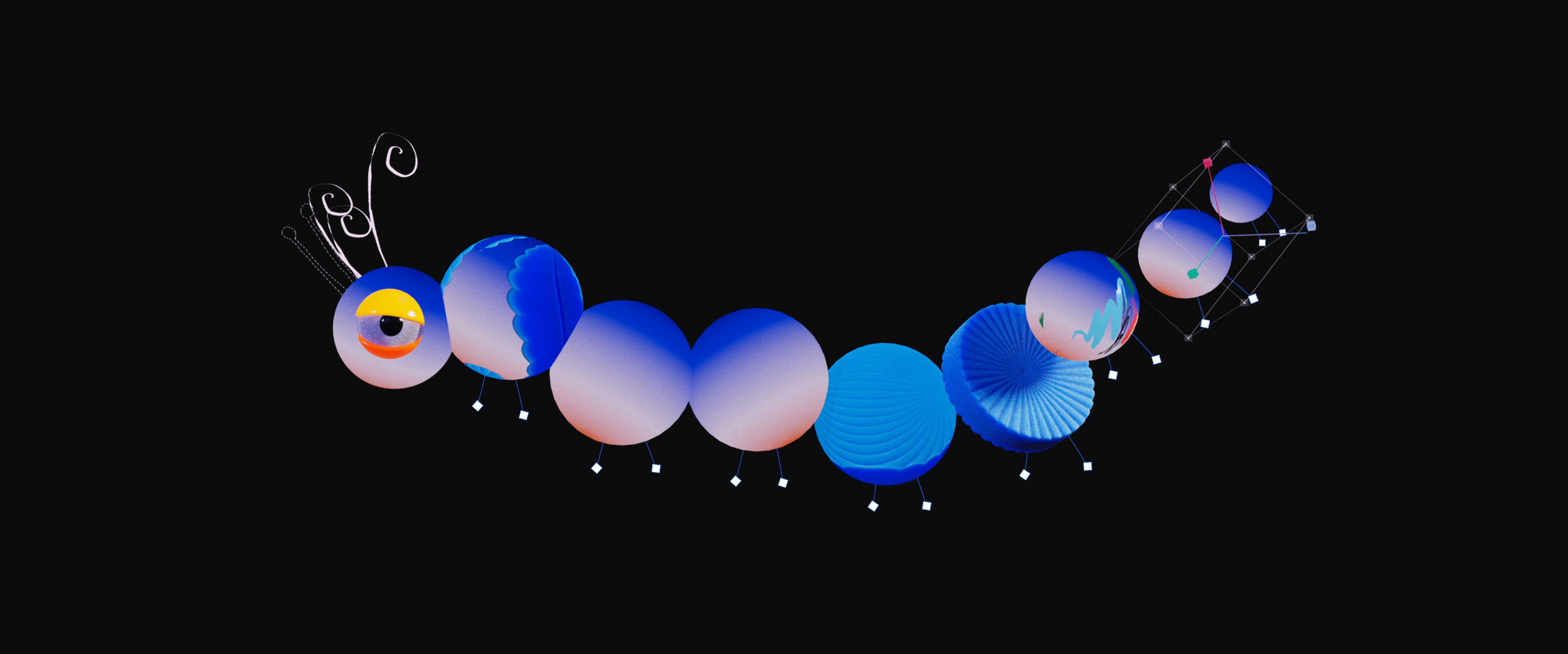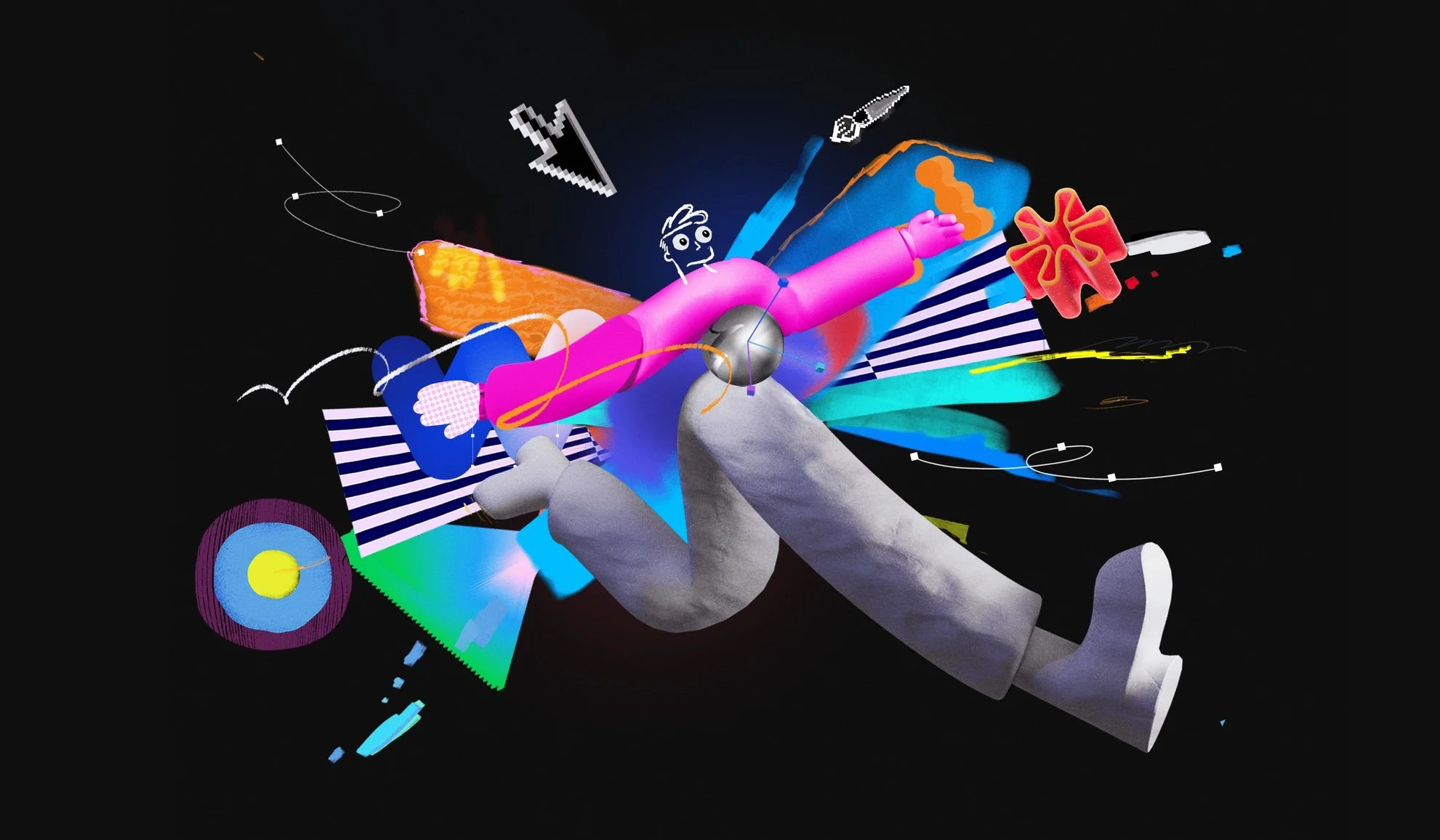 Our film was process-driven, showcasing the tools and techniques of the digital journey of the makers. Bounding boxes, anchor points, characters made of design elements…this entire video was one big nod to the design process. Our favorite part of this project was turning the exploration and development imagery into core art in the final product. Wireframe passes of the character running made it into the start of the run cycle to land the message that art is about process not product. We used screen recordings of layer selections, bad glitched renders that would otherwise hit the trash bin, happy accidents thoughtfully discovered, as well as comps with hundreds of layers to imitate all of the above.